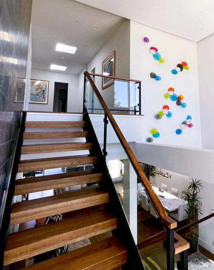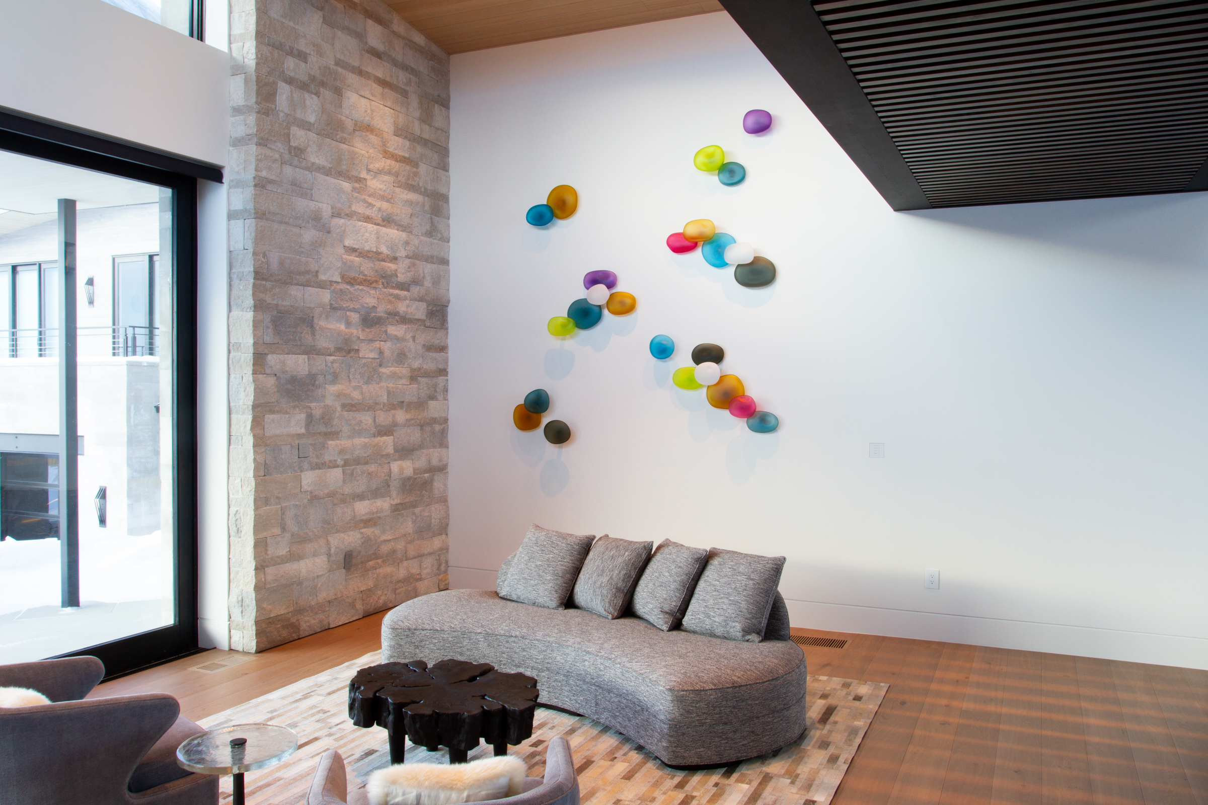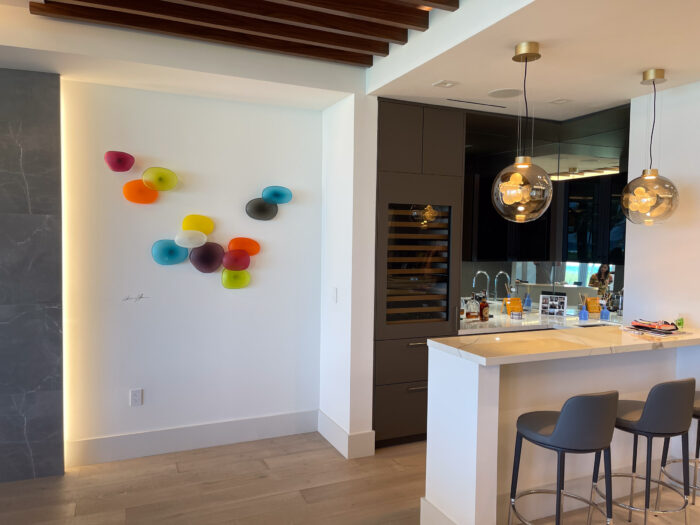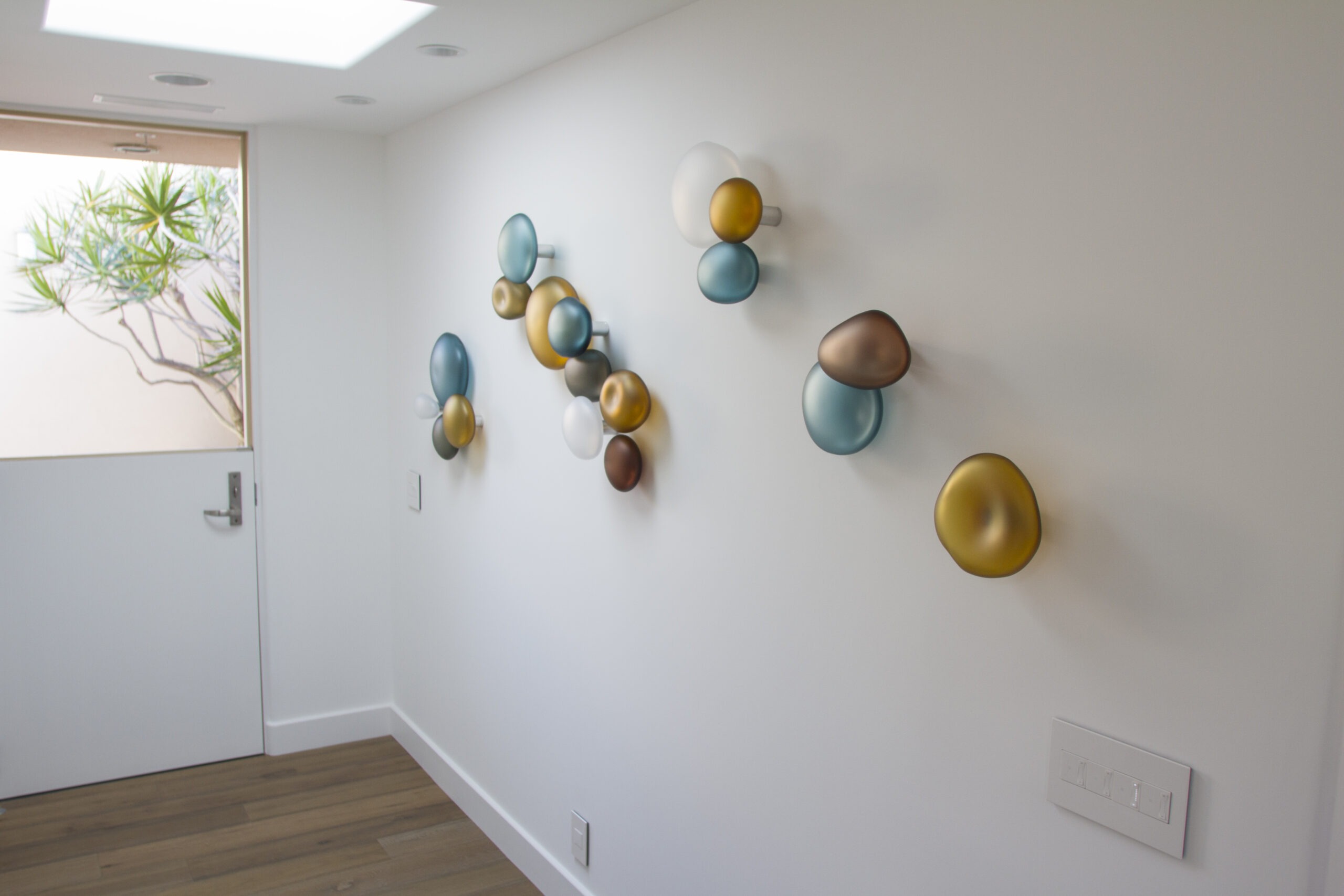 Jeffries Glass has experience in creating custom hand blown rock wall installations for commercial spaces such as hospitals and offices locally and internationally. No project is too big. We also have experience in installing indoors and outdoors on large, small and curved walls. For all installations, the aluminum brackets we use to mount each piece to a wall is anodized with a clear coat finish that protects the life of the aluminum so they can be mounted indoors or outdoors.