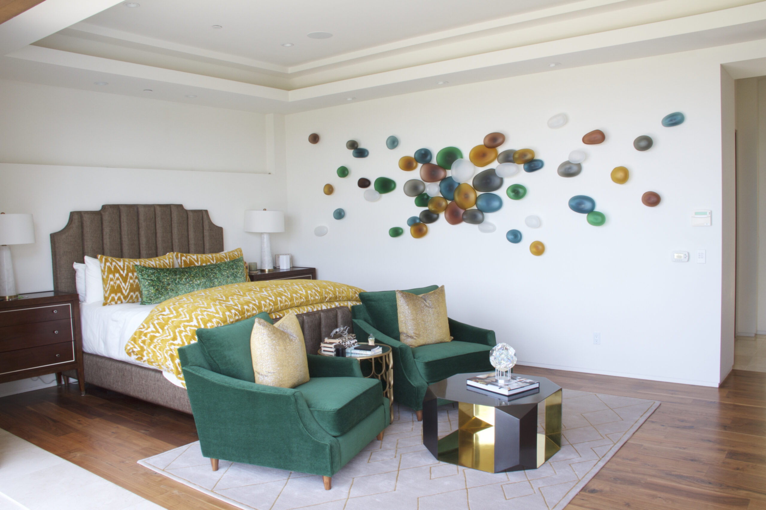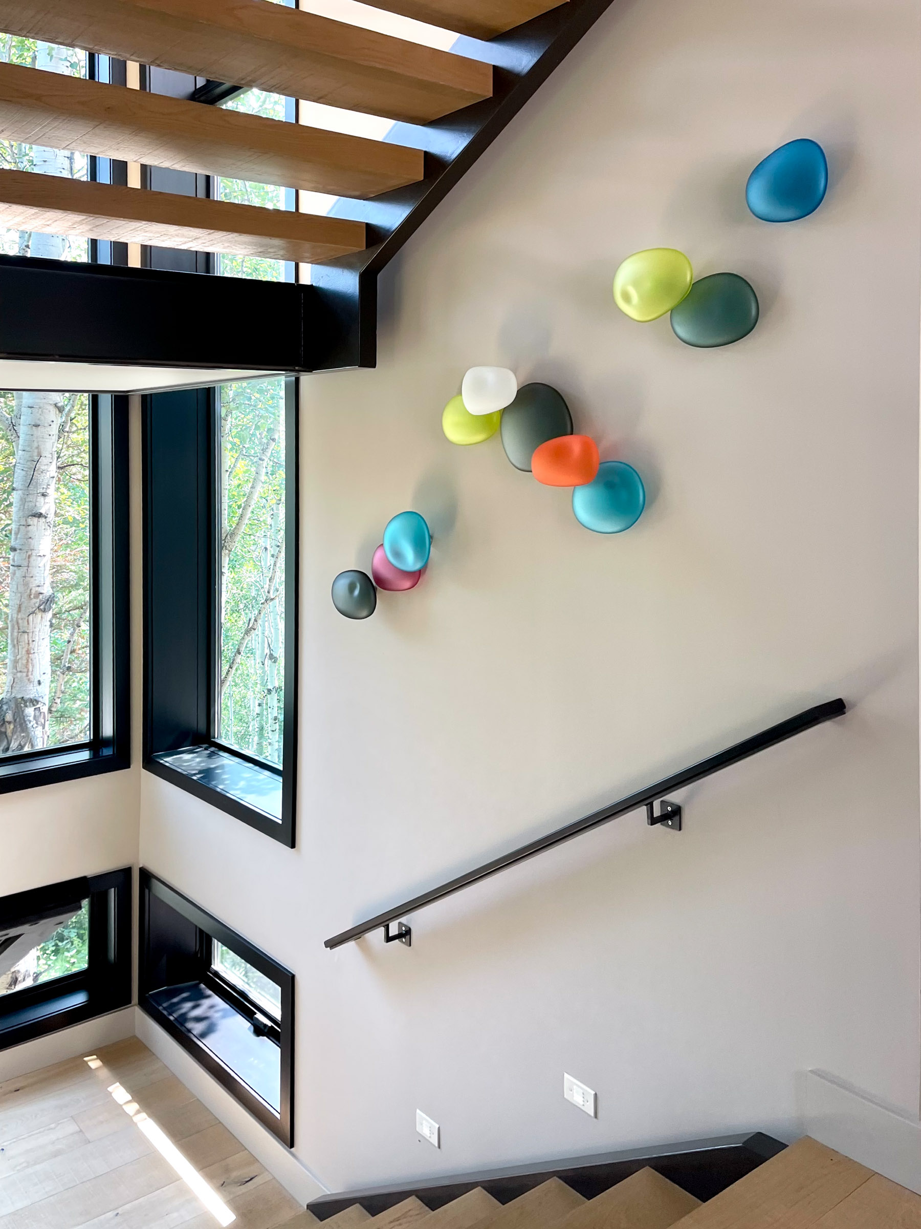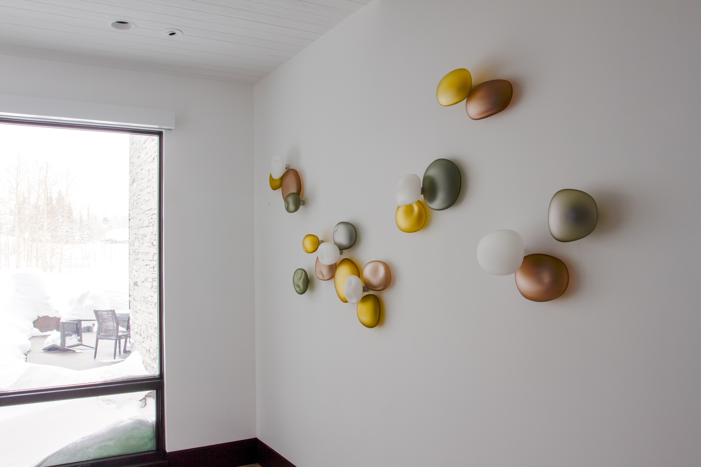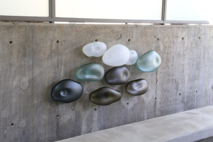 The rock series installations are inspired by the river beds along the Russian River, located in Northern California. Unique, fluid shapes that organic forms take on, and the textured surface that glass can have invites the viewer to come closer. Jeffries Glass enjoys the challenge of making each form different in shape and size, and choosing a color palette that creates a mood. Using color, we can create pathways to lead the viewers’ eye, and the empty space becomes the simple beauty in the overall composition.